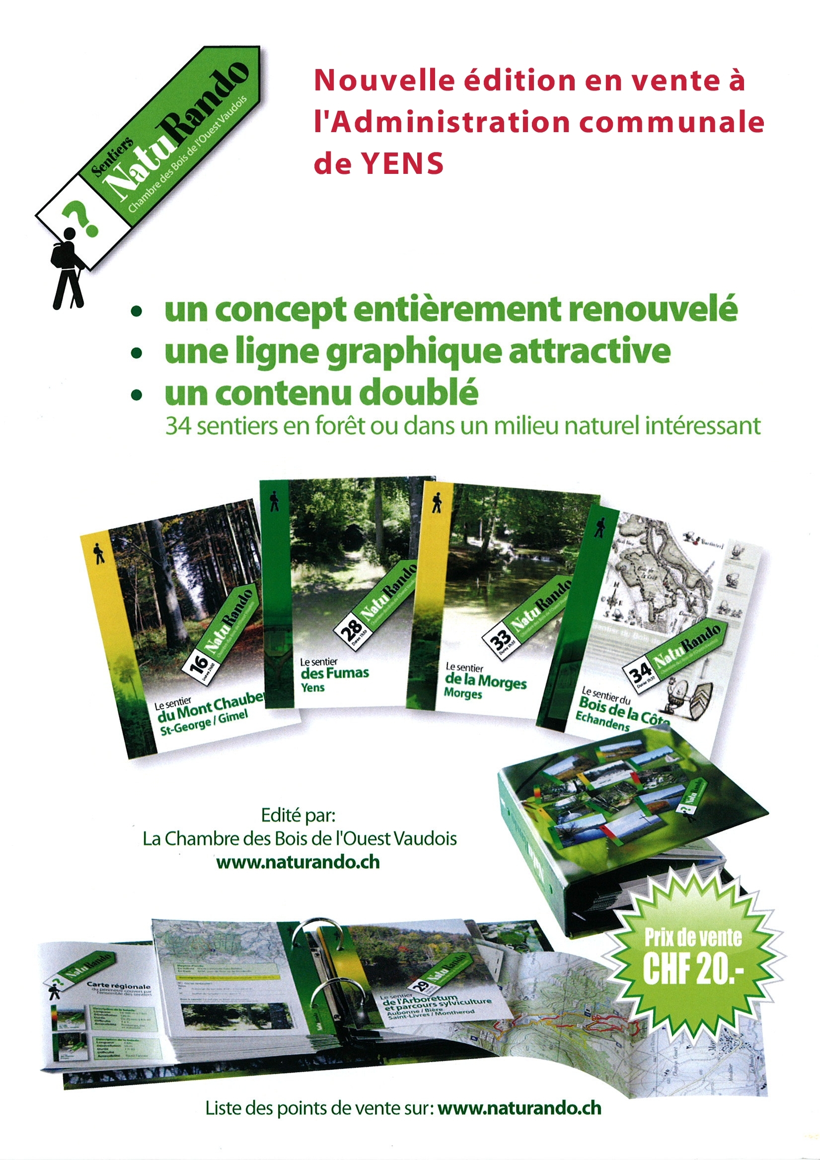 Le guide Naturando comprenant les descriptifs de 39 sentiers ainsi que la brochure Arbres et Arbustes des forêts vaudoises est en vente à l'Administration communale.
